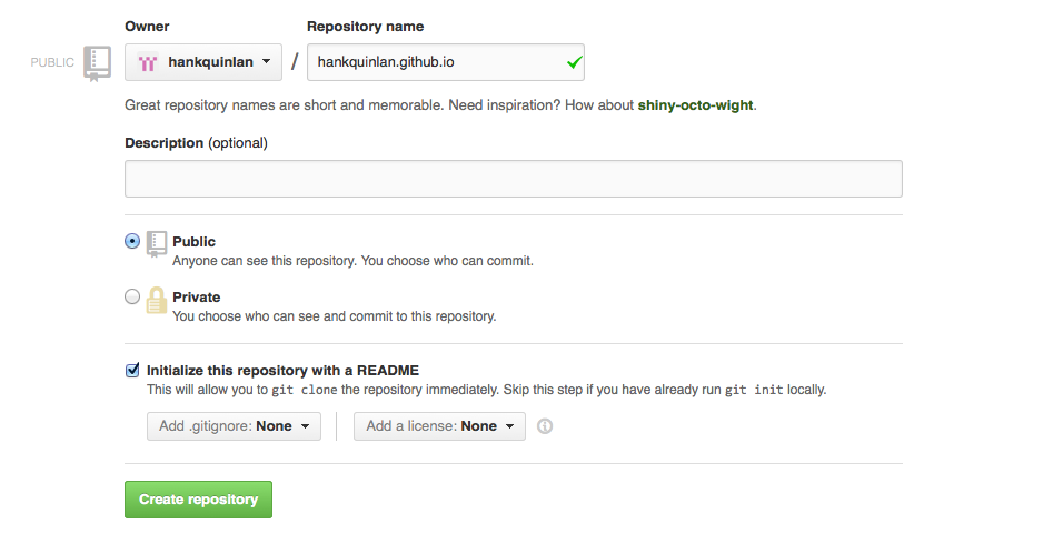 2 Name your repository username.github.io, replacing username with your GitHub username. Be sure it is public and go ahead and tell GitHub to create a README file upon generating the repo.